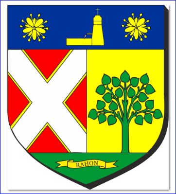 Parti: au 1er de gueules au sautoir d'argent bordé d'or, au 2e d'or au tilleul de sinople mouvant de la pointe; le tout sur une terrasse du même chargé d'un listel d'or chargé de l'inscription « RAHON » en lettres de sable; le tout sommé d'un chef d'azur chargé d'une fontaine du lieu d'or sommée d'une croix d'argent et jaillissant du même, accostée de deux fleurs de tilleul d'or.