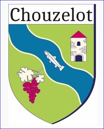 De sinople à la bande ondée d'azur bordée d'or et chargée d'une truite du même, accompagnée en chef d'un pigeonnier d'or, ouvert, ajouré et maçonné de sable, essoré de gueules et en pointe d'une grappe de raisin de gueules tigée et feuillée d'or; le tout sommé d'un comble d'argent chargé de l'inscription « Chouzelot » de sable.