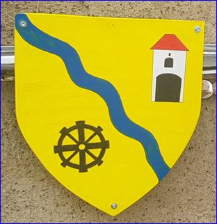 D'or à la cotice ondée d'azur, accompagnée en chef un bâtiment du lieu [porte du Ménil] d'argent, essoré de gueules, ouvert et ajouré de sable et en pointe d'une roue de moulin de sable.
