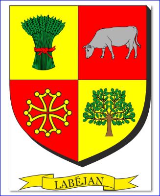 (2024) Écartelé: au 1er d'or à la gerbe de blé de sinople liée de gueules, au 2e de gueules à la vache «gasconne» paissante au naturel, au 3e de gueules à la croix cléchée, vidée et pommetée de douze pièces d'or, au 4e d’or au chêne de sinople fûté de tenné.