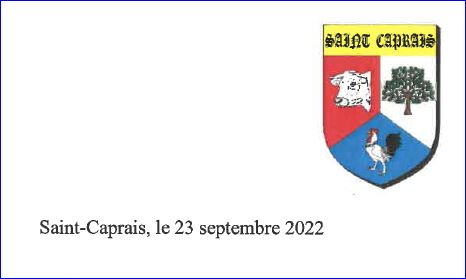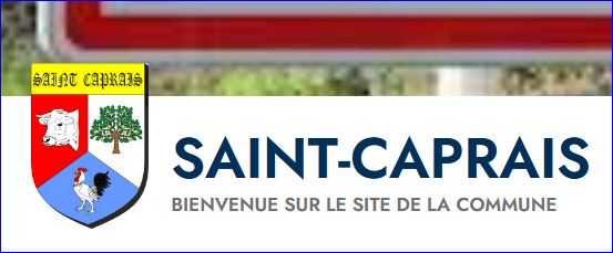 (2022) Tiercé en pairle renversé: au 1er de gueules à la tête de vache d'argent, au 2e d'argent au chêne coupé de sinople fûté de tenné et englanté d'or, au 3e d'azur au coq chantant d'argent, becqué d'or, langué, crêté et barbé de gueules, la queue de sable; le tout sommé d'un comble d'or chargé de l'inscription « SAINT CAPRAIS » en lettres capitales gothiques de sable.