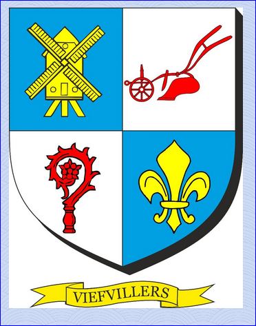Écartelé: au 1er d'azur au moulin à vent d'or, au 2e d'argent à la charrue de gueules, au 3e d'argent à la volute de crosse d'or, au 4e d'azur à la fleur de lis d'or.