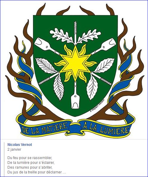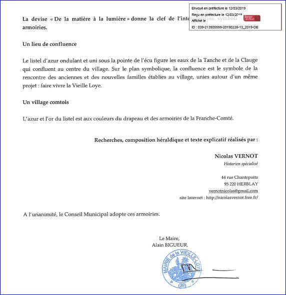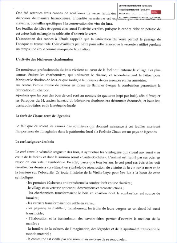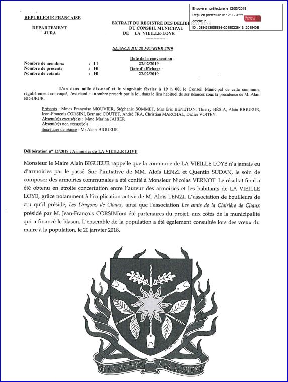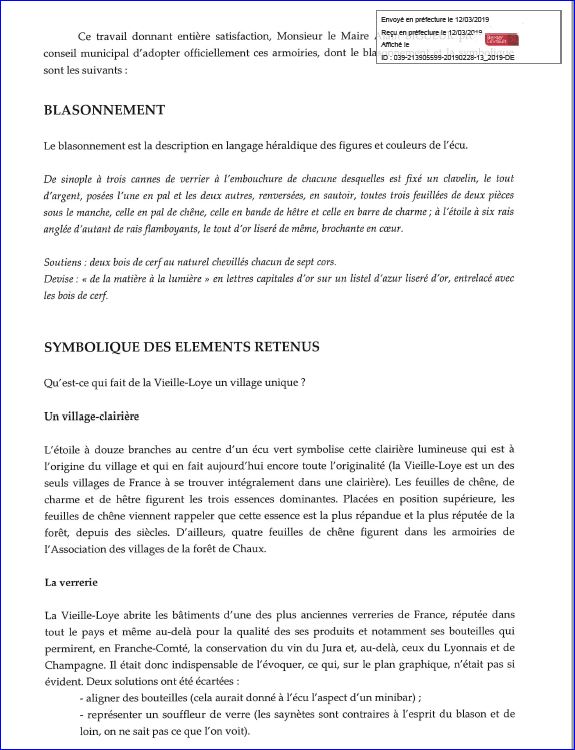 (2019) De sinople à trois cannes de verrier à l'embouchure de chacune desquelles est fixé un clavelin [bouteille de 62 cl], le tout d'argent, posées l'une en pal et les deux autres, renversées, en sautoir, toutes trois feuillées de deux pièces sous le manche, celle en pal de chêne, celle en bande de hêtre et celle en barre de charme, à l’étoile à six rais anglée d'autant de rais flamboyants, le tout d'or liseré de même, brochante en cœur.
