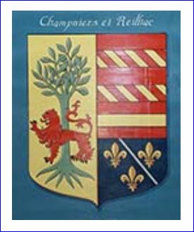 Parti: au 1er d'or à l'arbre de sinople et au lion léopardé de gueules, armé de sable brochant sur le fût de l'arbre, au 2e coupé, au I de gueules à cinq cotices d'or, à la fasce de gueules brochant sur les cotices et au chef du même, au II d'azur à trois fleurs de lis d'or accompagnées au filet en bande d'argent entre les deux fleurs de lis de dextre et celle de senestre et à la fasce de gueules chargée d'une divise d'or brochant sur le coupé.