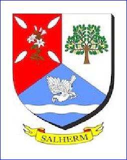 Tiercé en pairle renversé: au 1er de gueules au lis des jardins d'argent, tigé et feuillé de sinople, accompagné de quatre otelles d'argent ordonnées et posées en sautoir, au 2e d'argent au chêne de tenné, feuillé de sinople et englanté d'or, au 3e d'azur à l'aigle fondant d'argent accompagné d'une trangle du même en pointe.
