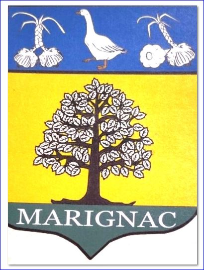 D'or à l'orme de tenné feuillé d'argent sur une terrasse de sinople chargée de l'inscription « MARIGNAC » en lettres capitales d'argent; au chef d'azur chargé d'une oie d'argent, becquée et membrée d'orangé, accostée de quatre têtes d'ail liées deux à deux, les tiges et feuilles tressées d'argent.