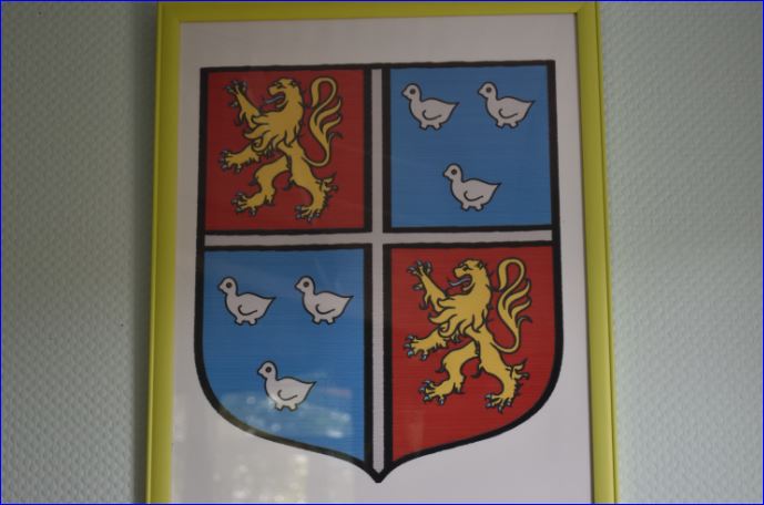 Écartelé: aux 1er et 4e de gueules au lion d'or armé et lampassé d'azur, aux 2e et 3e d'azur à trois merlettes d'argent, au filet en croix d'argent brochant sur la partition.