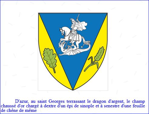 (2024) D'azur à saint Georges à cheval terrassant le dragon de sa lance, le tout d'argent; chaussé d'or chargé à dextre d'une feuille de chêne de sinople posée en bande et à senestre d'un épi de blé tigé et feuillé du même posé en barre.