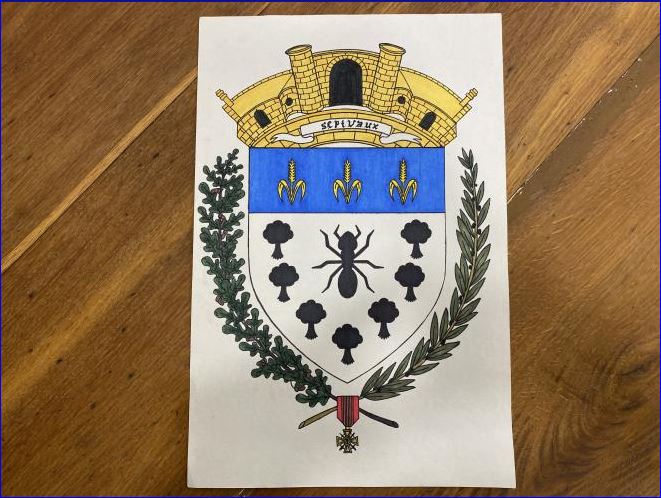 (2025) D'argent à la fourmi de sable accompagnée aux flancs et en pointe de sept arbres du même ordonnés en orle; au chef d'azur chargé de trois épis de blé tigés et feuillés d'or.