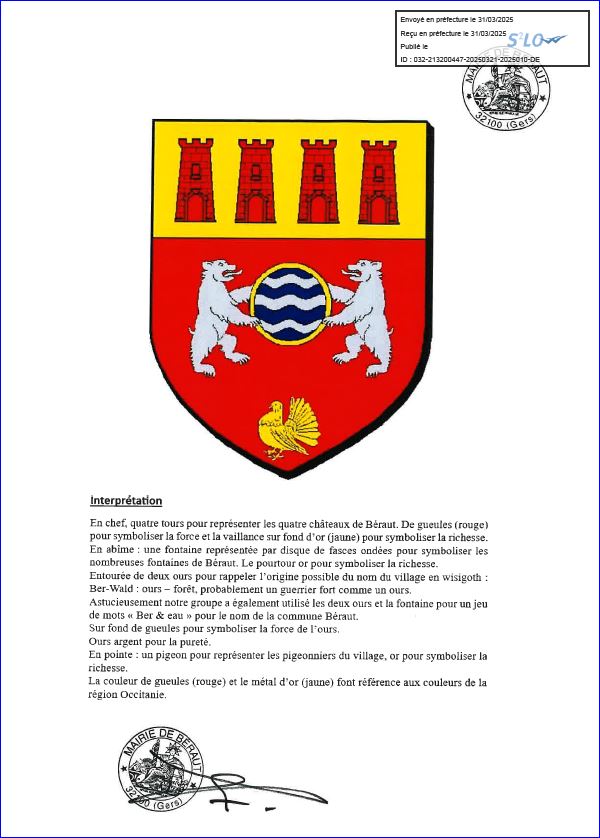 (2025) De gueules à la fontaine héraldique d'azur, traversée de trois sources ondées d'argent, cerclée d'or, supportée par deux ours rampants et affrontés d'argent et accompagnée en pointe d'un pigeon d'or; au chef d'or chargé de quatre tours de gueules maçonnées de sable.