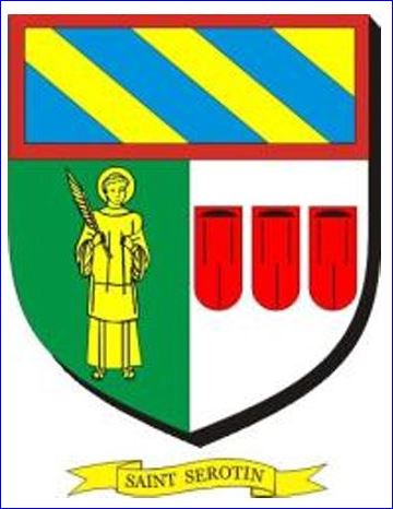 (2013) Parti: au 1er de sinople à saint Sérotin d'or, au 2e d'argent à trois tuiles de gueules rangées en fasce; le tout sommé d'un chef bandé d'or et d'azur et à la bordure de gueules.