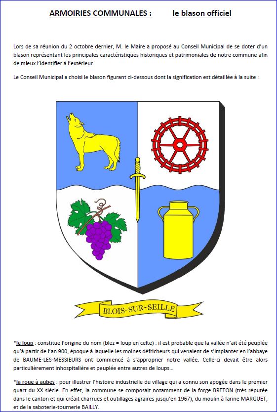 Écartelé, le trait du coupé ondé: au 1er d'azur au loup arrêté et hurlant d'or, au 2e d'argent à la roue à aubes de gueules, au 3e d'argent à la grappe de raisin de pourpre tigée et feuillée au naturel, au 4e d'azur à la bouille à lait d'or; à l'épée basse d'or brochant sur la partition.