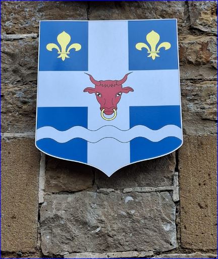 D'azur à la croix d'argent chargée en cœur d'un rencontre de buffle de gueules bouclé d'or et cantonnée en chef de deux fleurs de lis du même, à la burelle ondée d'argent brochant en pointe.