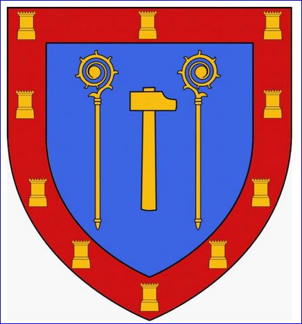D'azur au marteau d'or accosté de deux crosses adossées du même; à la bordure cousue de gueules chargée de dix tours d'or.
