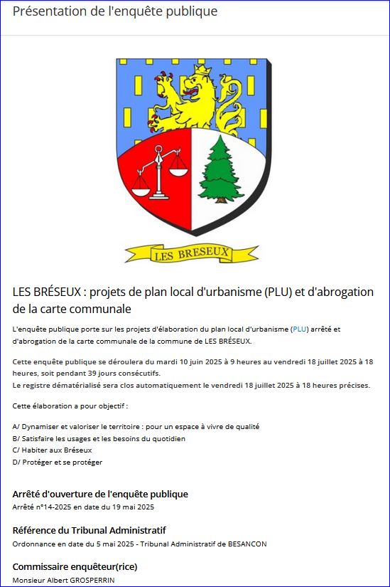 Présentation de l'enquête publique pour le PLU sur le site registre-dematerialise.fr, 2025.