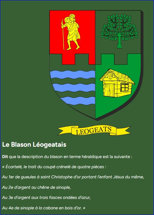 (2024) Écartelé, le trait du coupé crénelé de quatre pièces: au 1er de gueules à saint Christophe portant l'enfant Jésus d'or, au 2e d'argent au chêne de sinople, au 3e d'argent à trois fasces ondées d'azur, au 4e de sinople à la cabane en bois d'or.