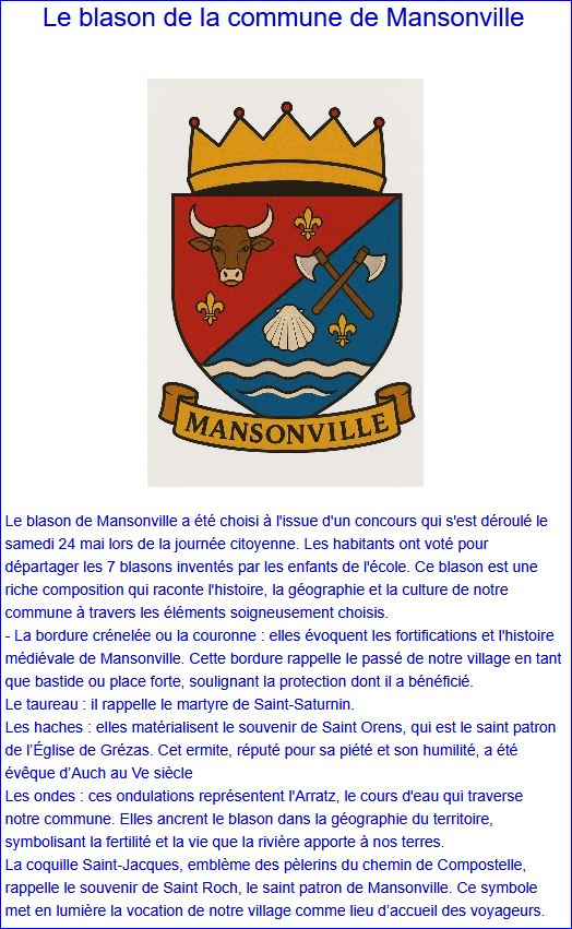 (2025) Taillé: au 1er de gueules au rencontre de vache de tenné, accorné d'argent, le museau de carnation, accompagné de deux fleurs de lis d'or, une en chef à senestre, l'autre en pointe à dextre, au 2e d'azur à la coquille d'argent et à la fleur de lis d'or rangées en fasce, accompagnées en pointe d'une burelle ondée d'argent, elle-même surmontant un filet ondé, alésé et aiguisé du même, la fleur de lis surmontée de deux haches d'argent, emmanchées de tenné et passées en sautoir, le fer de la hache posée en bande brochant sur la partition.