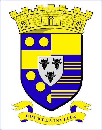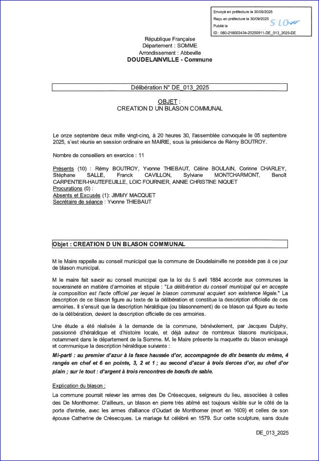 (2025) Mi-parti: au 1er d'azur à la fasce haussée d'or accompagnée de dix besants du même, quatre rangés en chef et six en pointe, 3, 2 et 1, au 2e d'azur à trois tierces d'or et au chef d'or plain; sur le tout, d'argent à trois rencontres de boeuf de sable.