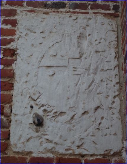 Blason sculpté (début XVIIe siècle) et martelé, sur le mur extérieur de l'église,