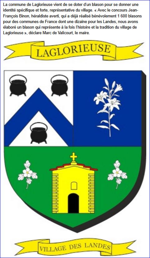 (2025) Coupé: au 1er parti au I d'argent au chevron d'azur accompagné de trois chaudrons de sable, au II d'azur au lis des jardins d'argent, au 2e de sinople à la Fontaine Saint-Guirons du lieu d'or, ouverte de sable, essorée de gueules et accostée de deux fleurs d'aubépine , tigées et feuillées d'argent, boutonnées d'or.