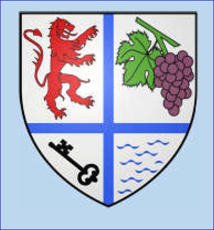 (2018) D'argent à la croix estrée d'azur, la traverse abaissée, cantonnée au 1er d'un lion contourné de gueules, au 2e d'une grappe de raisin de pourpre tigée et feuillée de sinople, au 3d'une clé contournée de sable posée en bande et au quatrième de vaguelettes d'azur en nombre.