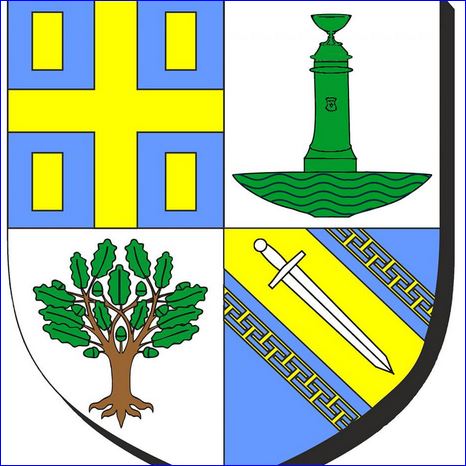 Écartelé: au 1er d'azur à la croix d'or cantonnée de quatre billettes du même, au 2e d'argent à la fontaine monumentale du lieu de sinople sur une terrasse isolée en demi-lune du même chargée d'ondes de sable, au3e d'argent au chêne de tenné, feuillé et englanté de sinople, au 4e d'azur à la bande d'or, chargée d'une épée basse d'argent et côtoyée de deux jumelles d'or potencées contre-potencées intérieurement.