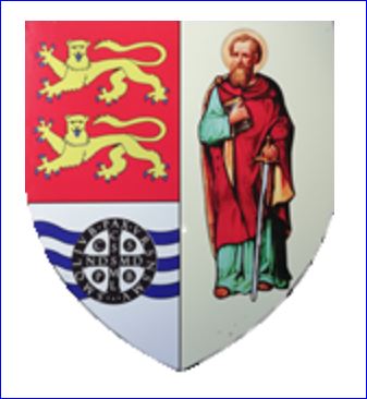 Parti: au 1er coupé au I de gueules à deux léopards d'or, armés et lampassés d'azur, l'un au-dessus de l'autre, au II d'argent à la tierce ondée d'azur et à la médaille de Saint-Benoît de sable et d'argent brochant sur la tierce, au 2e d'argent à saint Paul au naturel.