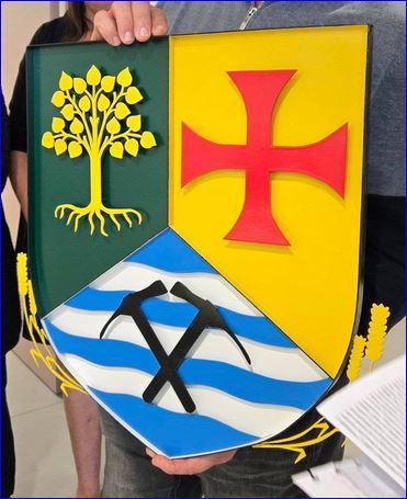 Tiercé en pairle renversé: au 1er de sinople à l'arbre d'or, au 2e d'or à la croix pattée et alésée de gueules, au 3e d'azur à trois fasces ondées d'argent et à deux pics de mineur de sable passés en sautoir et brochant sur les fasces.