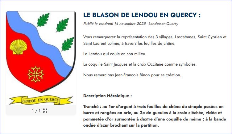 (2025) Tranché: au 1er d'argent à trois feuilles de chêne de sinople posées en barre et ordonnées en orle, au 2e de gueules à la coquille d’or et à la croix cléchée, vidée et pommetée de douze pièces du même rangées en bande; à la bande ondée d'azur brochant sur la partition.