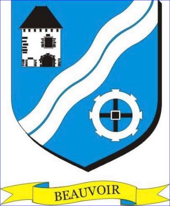 D'azur à la barre ondée d'argent chargée d'un filet ondé du champ, accompagnée en chef du presbytère du lieu d'argent, ouvert, ajouré et essoré de sable et en pointe d'une roue de moulin d'argent, les rayons de sable en croix, le moyeu carré du même bordé d'argent.