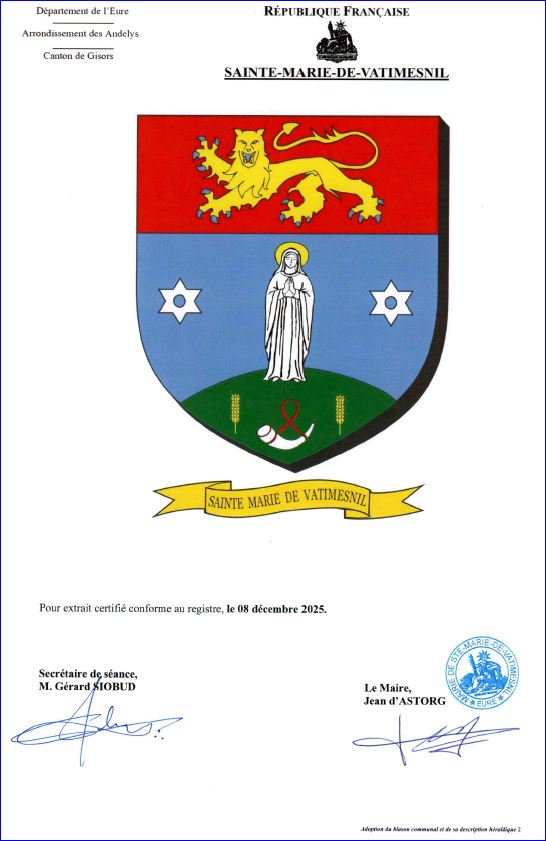 (2025) d'azur à sainte Marie, les mains jointes, d'argent, nimbée d'or, accostée de deux molettes d'argent et posée et brochant sur un mont de sinople chargé d'un huchet d'argent, aguiché, virolé, embouché et lié de gueules et accosté de deux épis de blé d'or; au chef cousu de gueules chargé d'un léopard d'or, armé et lampassé d'azur.