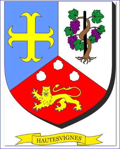 Tiercé en pairle renversé: au 1er d'azur à la croix ancrée d'or, au 2e d'argent au cep de vigne tuteuré au naturel, au 3e de gueules au léopard d'or armé et lampassé de gueules surmonté de trois cailloux mal ordonnés d'argent.