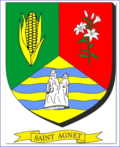 (2026) Tiercé en pairle renversé: au 1er de sinople à l'épi de maïs d'or, au 2e de gueules au lis des jardin au naturel, au 3e d'or à trois fasces ondées d'azur et à la statue du lieu d'argent brochant sur les fasces.