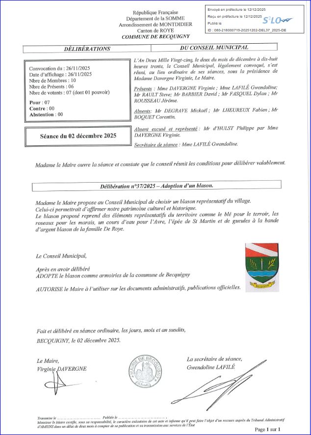 (2025) De sinople à la fasce ondée abaissée d'azur bordée d'argent, surmontée d'une épée basse d'argent garnie d'or, ladite épée adextrée de quatre épis de blés, rangés en bande, tigés et feuillés, les tiges courbées et empoignées et senestrée de trois roseaux à massettes, posés et rangés en barre, feuillés à senestre, le tout du même; au chef de gueules à la bande d'argent.