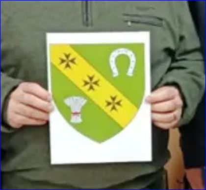 (2026) De sinople à la bande d'or chargée de trois croix de Malte de sable et accompagnée «en chef à senestre d'un fer à cheval d'argent et en pointe à dextre d'une gerbe de blé du même liée de gueules.