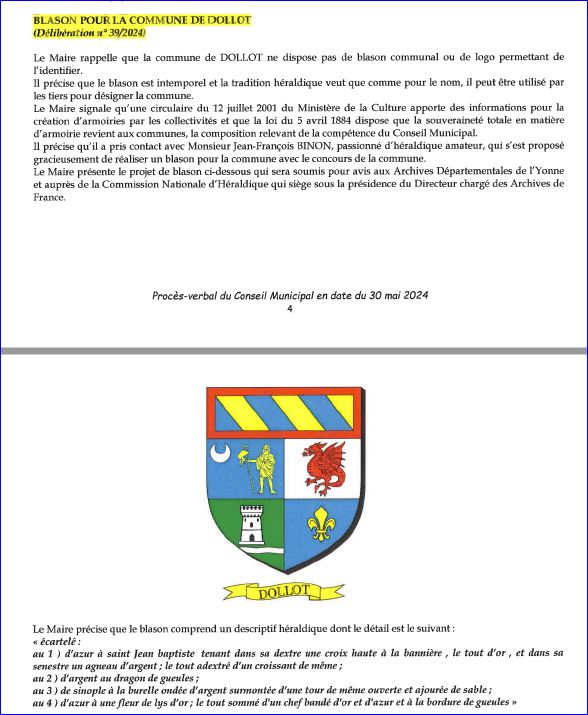(2024) Écartelé: au 1er d'azur à saint Jean Baptiste d'or tenant dans sa dextre une croix haute avec sa bannière du même et dans sa senestre un agneau d'argent, adextré en chef d'un croissant du même, au 2e d'argent au dragon de gueules, au 3e de sinople à la tour d'argent ouverte et ajourée de sable, accompagnée en pointe d'une burelle d'argent, au 4e d'azur à la fleur de lis d'or; le tout sommé d'un chef bandé d'or et d'azur et à la bordure de gueules.