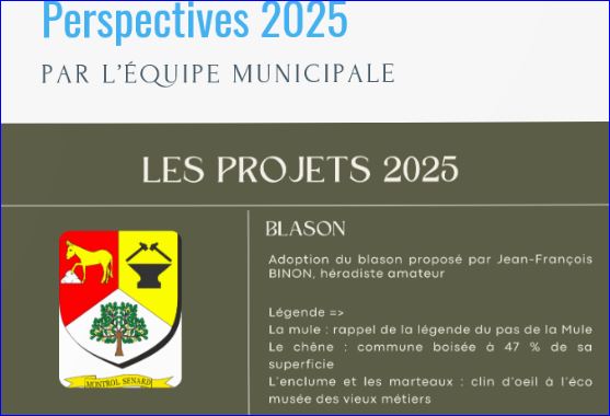 (2025) Tiercé en pairle renversé: au 1er de gueules à la mule d'or, la patte antérieure dextre posée sur un rocher isolé d'argent, au 2e d'or à l'enclume de sable surmonté de deux marteaux affrontés du même , celui de dextre posée en barre et celui de senestre posé en bande, au 3e d'argent au chêne coupé au naturel englanté d'or.