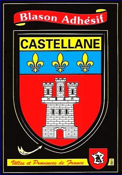 De gueules à la tour crénelée de cinq pièces d'argent, ouverte du champ et sommée de trois tourelles d'argent, le tout ajouré et maçonné de sable; au chef cousu d'azur chargé de trois fleurs de lis d'or.
