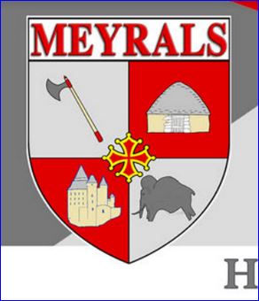 Écartelé: au 1er d'argent à la hache d'armes de sable posée en bande, emmanchée d'or, les extrémités du manche de gueules, au 2e de gueules à la cabane de pierres sèches d'or, couverte d'argent, au 3e de gueules au château du lieu [château de la Roque des Péagers] d'or essoré d'argent,au 4e d'argent à la représentation préhistorique de mammouth de sable; à la croix cléchée pommetée de douze pièces d'or, remplie de gueules brochant en abîme sur la partition.