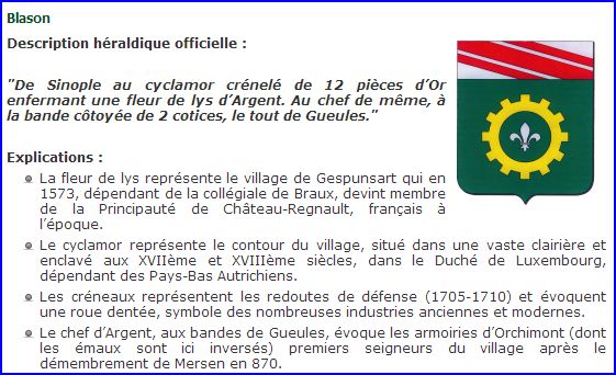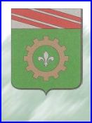 (1998) De sinople au cyclamor crénelé de douze merlons d'or enfermant une fleur de lis d'argent; au chef du même chargé d'une bande de gueules côtoyée de deux cotices du même.