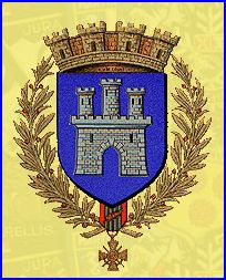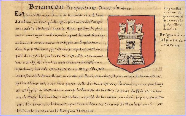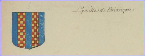 (1696) D'azur à la tour crénelée de cinq pièces d'argent, ouverte du champ et sommée de trois tourelles d'argent, le tout ajouré et maçonné de sable.