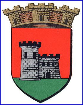 (1965) De gueules à la tour senestrée d'un avant-mur, le tout d'argent, crénelé, ouvert, ajouré et maçonné de sable, posé sur une terrasse cousue de sinople.