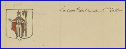 D'argent à saint Vallier, évêque, de carnation bénissant de la main dextre, vêtu d'une aube d'argent, la chape d'azur doublée de gueules, la mitre d'azur bordée d'or, tenant de la main senestre une crosse du même.