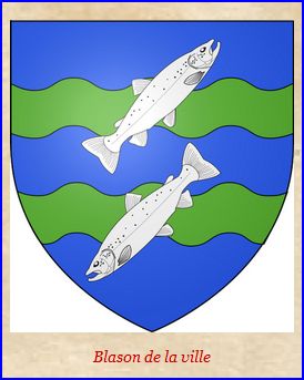D'azur à deux fasces ondées cousues de sinople et brochant sur le tout, à deux saumons d'argent posés en barre, rangés en pal, celui du chef contourné.