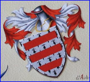 De sinople à trois fasces alésées cousues de gueules, chaque fasce chargée de deux coquilles d'or; accompagnée de quatorze mouchetures cousues de sable et ordonnées en orle.