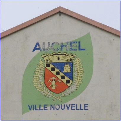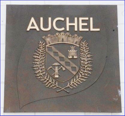 Tranché: au 1er d'azur à la tour donjonnée d'or, maçonnée de sable, au 2e de gueules à deux pics de mineur passés en sautoir et une lampe de mineur brochant en coeur, le tout d'or; à la bande d'or chargée de cinq losanges de sable, brochant sur la partition.