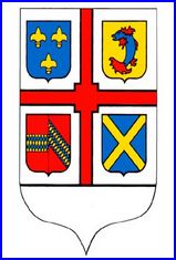 (1989) D'argent à la croix estrée de gueules, nouée en carré, cantonnée de quatre écussons: au 1er d'azur à trois fleurs de lis d'or, au 2e d'or au dauphin d'azur, barbé, crêté, oreillé et lorré de gueules, au 3e parti au I de gueules à la fasce losangée d'or et d'azur et au II de gueules à la bande losangée d'or et d'azur, au 4e d'azur au sautoir d'or; à la plaine d'argent.