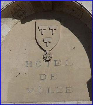 Blason sculpté sur le fronton de la mairie (Photo Jacques Dulphy, 2012).
