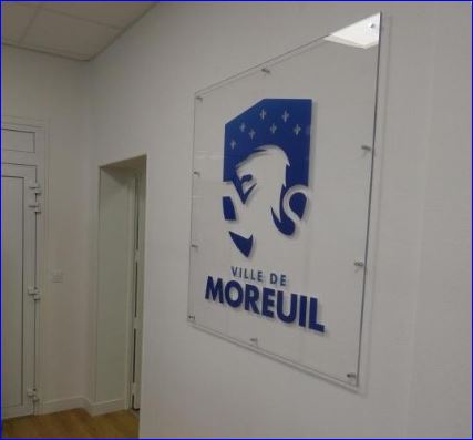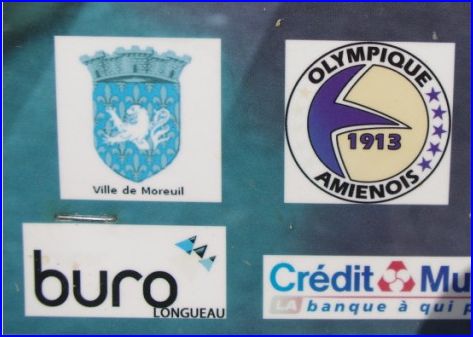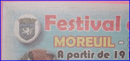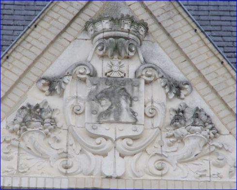 Blason au fronton de l'hôtel de ville. L'hôtel de ville a été reconstruit en 1931 après les destructions de la Grande Guerre. Le lion n'y est pas naissant, mais représenté par sa tête seule, et coupée. De même, le champ n'y est pas semé de fleur de lys, mais de besants. On ne connait pas l'origine de ces erreurs manifestes. Les besants (pas plus que la tête coupée) ne se justifient, sinon, pour les seconds, par un refus des lys.
