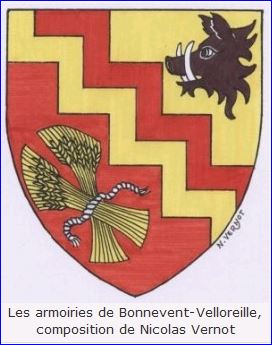 (2007) Tranché vivré: au 1er d'or à la hure de sanglier de sable, défendue et allumée d'argent, au 2e de gueules à deux gerbes de blé d'or, lies d'argent passées en sautoir et posées en bande; à la bande vivrée brochant sur la partition de l'un en l'autre.